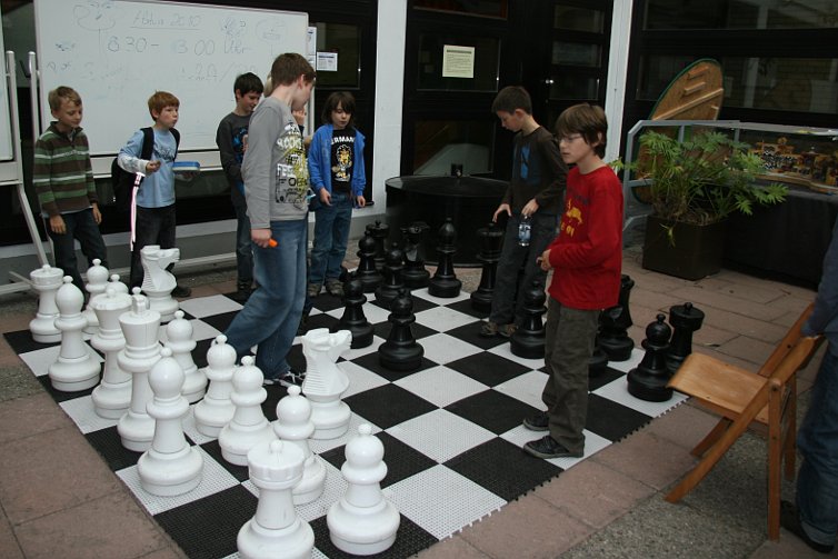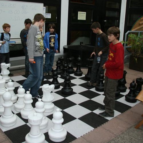- schafft er eine Kletterwand auf dem Hartplatz, ein GO-Spiel im Atrium an